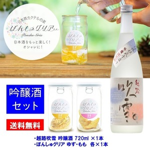 日本酒を注ぐだけで簡単に日本酒サングリアが作れる今話題の「ぽんしゅグリア」の「ゆず」「もも」の2本と、高野酒造を代表する日本酒の銘柄「越路吹雪」の吟醸酒のセットです。