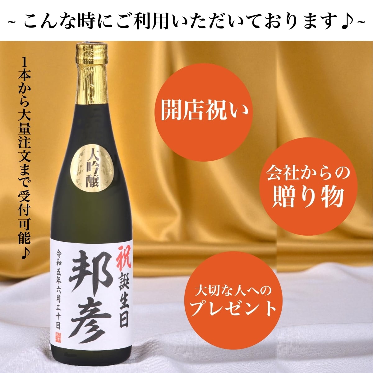 創業明治32年(西暦1899年)、新潟の蔵元、高野酒造が丹精込めて醸し上げた大吟醸に、世界に一つだけのオリジナルラベルを貼って、お届けします。
